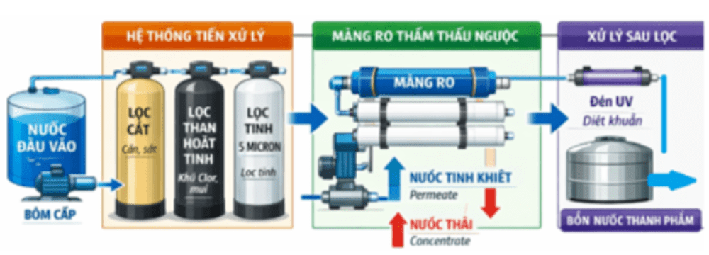 • Khả năng loại bỏ 99–99,8% tạp chất hòa tan