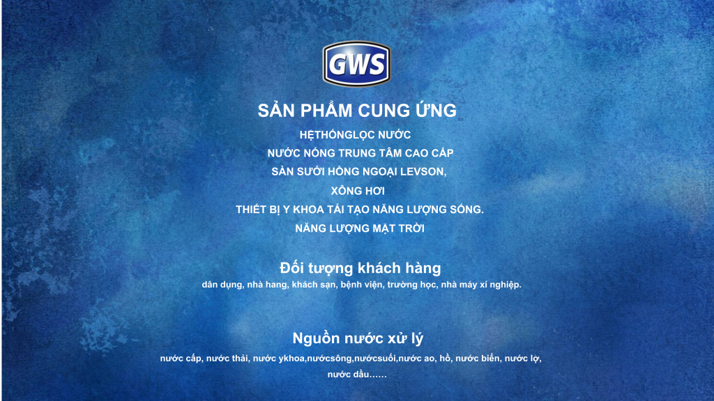 Galaxy Water Solutions – GWS nghiên cứu nguồn nước đầu nguồn của Việt Nam đến năm 2008 -2012 từ đó GWS tiên phong phát triển nghành xử lý nước dân dụng, và chính thức thành lập vào năm 2012 tại TPHCM. Trụ sở chính tại TPHCM và Văn phòng tại Hà Nội. Là đơn vị xử lý nước tiên phong hàng đầu tại Việt Nam, GWS xây dựng một nền tảng khoa học & sản phẩm cao cấp nhất của thị trường thế giới về công nghệ xử lý nước tiên tiến nhất & hiện đại nhất, thân thiện với môi trường. GWS là đơn vị chuyên tư vấn, thiết kế & lắp đặt hệ thống xử lý nước dành cho:Bệnh viện, Trường học, Nhà hàng, Khách sạn, Nhà máy, Xí nghiệp, Văn phòng, Quân đội, Nhà trẻ, Nhà thờ, Chùa chiền,…. GWS là nhà phân phối độc quyền của nhiều công ty và thương hiệu đẳng cấp thế giới từ Mỹ & các nước Châu Âu, Châu Á : Pentair, Argonide, Selecto, Erie, Atlas Filtri, EcoSoft, Ochsner, Levson…