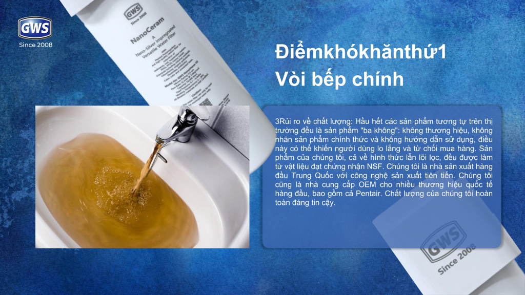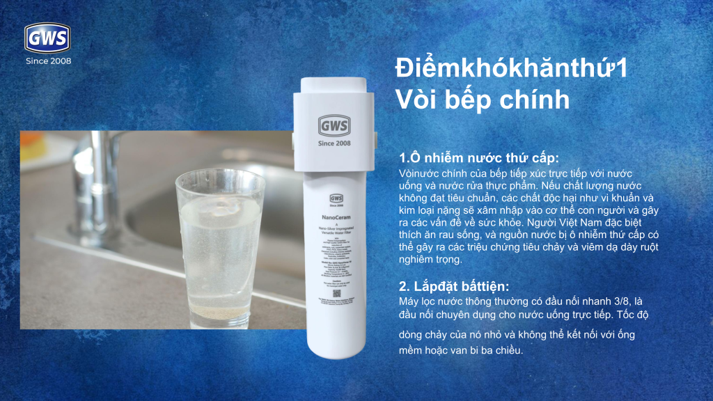 Trong sinh hoạt hằng ngày, đặc biệt tại vòi nước bếp và các điểm cấp nước cuối, nguy cơ ô nhiễm nước thứ cấp luôn tiềm ẩn do nước tiếp xúc trực tiếp với đường ống, thiết bị và môi trường xung quanh. Nếu chất lượng nước không đảm bảo, các thành phần như vi khuẩn, kim loại nặng, clo dư và hóa chất tồn dư có thể xâm nhập vào cơ thể qua nước uống, nước rửa thực phẩm, gây ảnh hưởng lâu dài đến sức khỏe.
