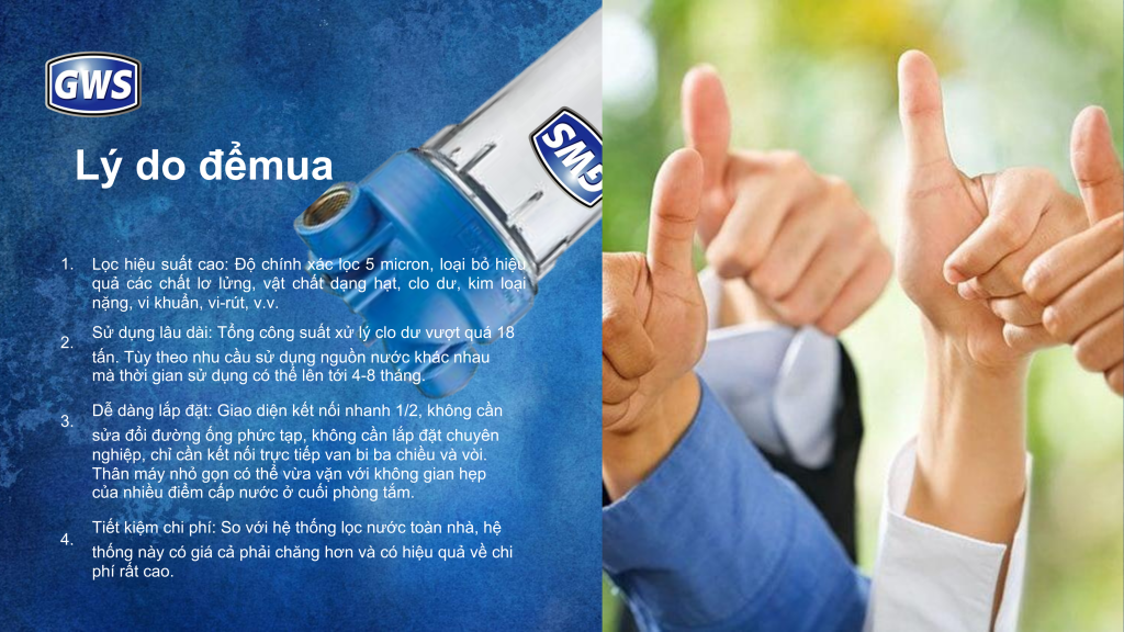 Galaxy Water Solutions – GWS nghiên cứu nguồn nước đầu nguồn của Việt Nam đến năm 2008 -2012 từ đó GWS tiên phong phát triển nghành xử lý nước dân dụng, và chính thức thành lập vào năm 2012 tại TPHCM. Trụ sở chính tại TPHCM và Văn phòng tại Hà Nội. Là đơn vị xử lý nước tiên phong hàng đầu tại Việt Nam, GWS xây dựng một nền tảng khoa học & sản phẩm cao cấp nhất của thị trường thế giới về công nghệ xử lý nước tiên tiến nhất & hiện đại nhất, thân thiện với môi trường. GWS là đơn vị chuyên tư vấn, thiết kế & lắp đặt hệ thống xử lý nước dành cho:Bệnh viện, Trường học, Nhà hàng, Khách sạn, Nhà máy, Xí nghiệp, Văn phòng, Quân đội, Nhà trẻ, Nhà thờ, Chùa chiền,…. GWS là nhà phân phối độc quyền của nhiều công ty và thương hiệu đẳng cấp thế giới từ Mỹ & các nước Châu Âu, Châu Á : Pentair, Argonide, Selecto, Erie, Atlas Filtri, EcoSoft, Ochsner, Levson…
