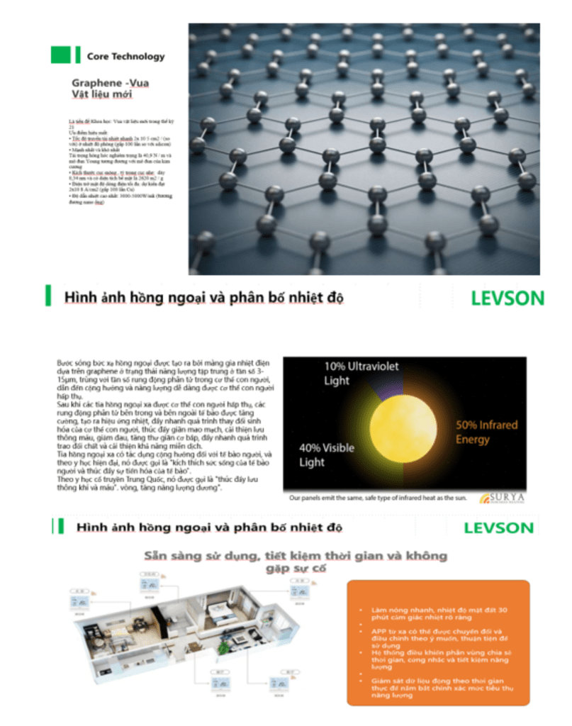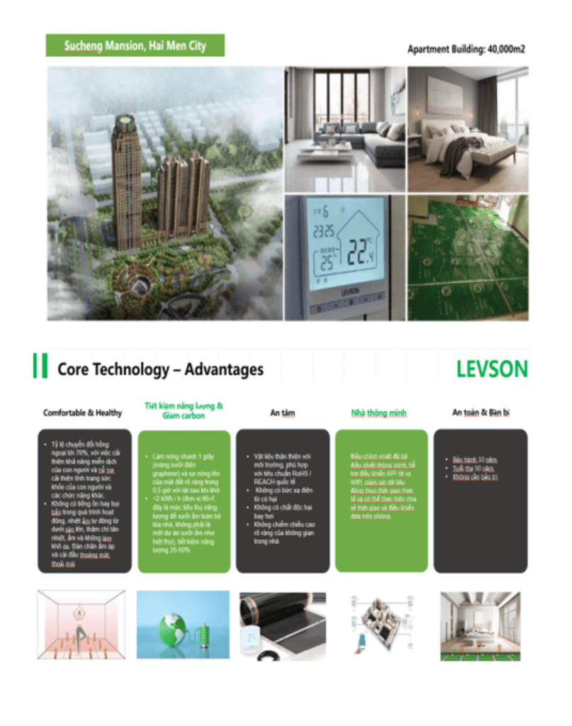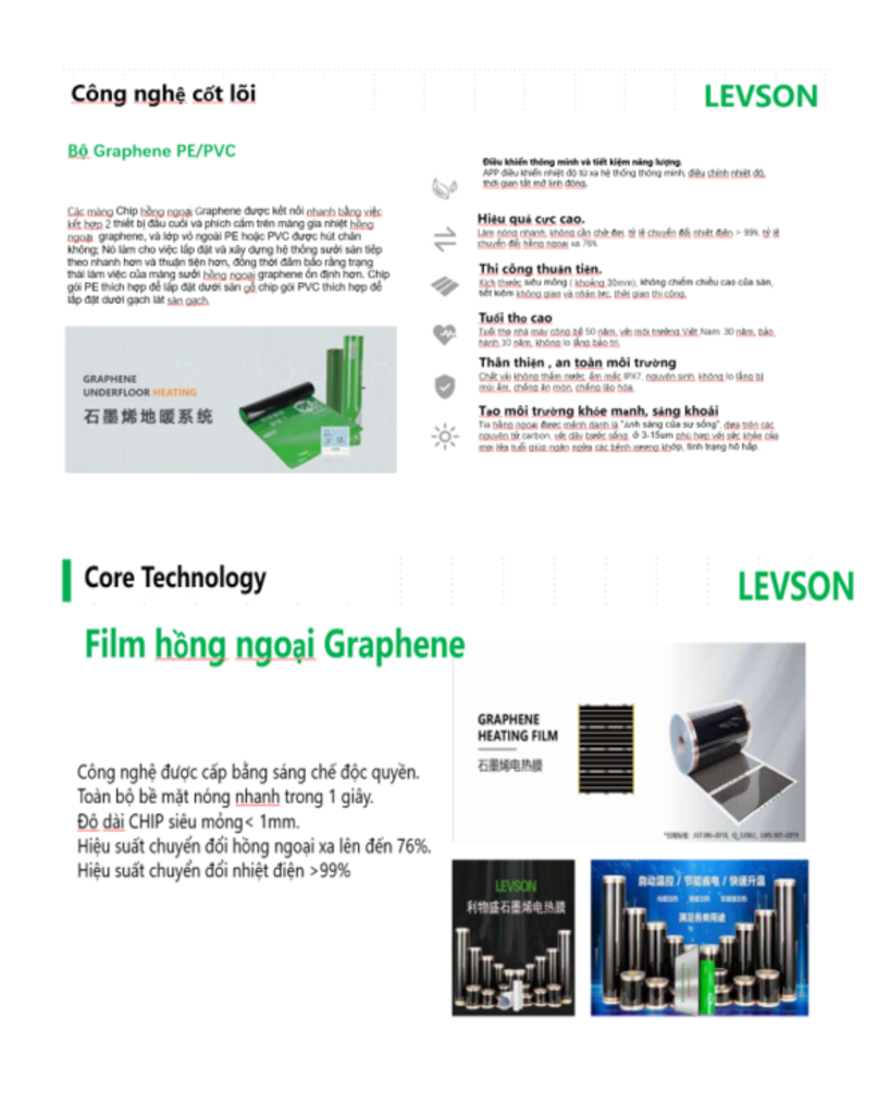 Trong hơn một thập kỷ, Levson đã tập trung vào graphene và đã tận tụy sản xuất vật liệu graphene chất lượng cao, chi phí thấp, quy mô lớn, cũng như nghiên cứu và phát triển, ủ và thương mại hóa trong nhiều lĩnh vực ứng dụng khác nhau, dẫn đến nhà cung cấp và sản xuất hệ thống sưởi ấm dưới sàn điện graphene. Chúng tôi tự hào có đại diện trên toàn cầu, mang đến trải nghiệm nâng cao cho khách hàng quốc tế của chúng tôi. Đội ngũ tận tụy của chúng tôi, từ Trung Quốc, Hồng Kông, Bắc Mỹ, đến Châu Âu, đến Vương quốc Anh, đảm bảo rằng chúng tôi hiểu được nhu cầu riêng biệt của các khu vực khác nhau, cung cấp hỗ trợ được cá nhân hóa và các giải pháp sưởi ấm phù hợp. Với cam kết mang đến mức độ hài lòng cao nhất cho khách hàng, các đại diện của chúng tôi luôn sẵn sàng hỗ trợ khách hàng trên toàn thế giới, tạo ra trải nghiệm liền mạch và cung cấp các giải pháp sưởi ấm đặc biệt cho khách hàng trên toàn cầu. LEVSON là nhà cung cấp duy nhất cho toàn bộ cơ quan ban nghành của Chính Phủ Trung Quốc. đạt hơn 100 bằng sáng chế Quốc Gia.